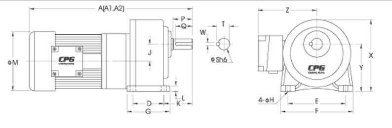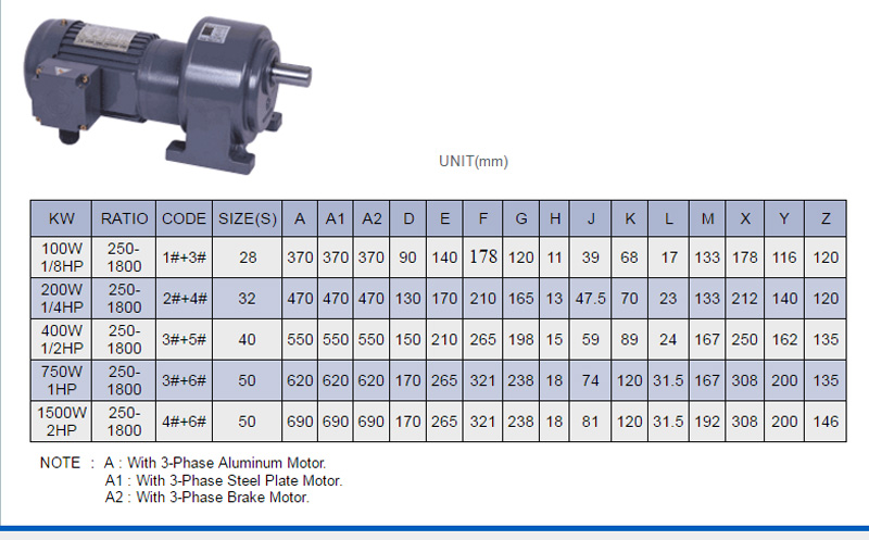 ขนาดมอเตอร์เกียร์ 380V. / 3 เฟส แบบตั้งพื้น รุ่น CH-S